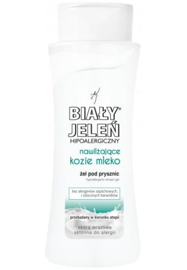 Hipoalergiczny żel pod prysznic Biały Jeleń z kozim mlekiem delikatnie oczyszcza, nie podrażniając skóry.Substancje pielęgnujące: • naturalne kozie mleko - zapewnia odpowiednie odżywienie i nawilżenie skóry, dzięki czemu odzyskuje ona elastyczność oraz jedwabistą gładkość • składnik działający jak naturalny dezodorant - hamuje rozwój bakterii. Przebadany dermatologicznie wśród osób z alergiami skórnymi. Nie zawiera alergenów, silikonów i sztucznych barwników.