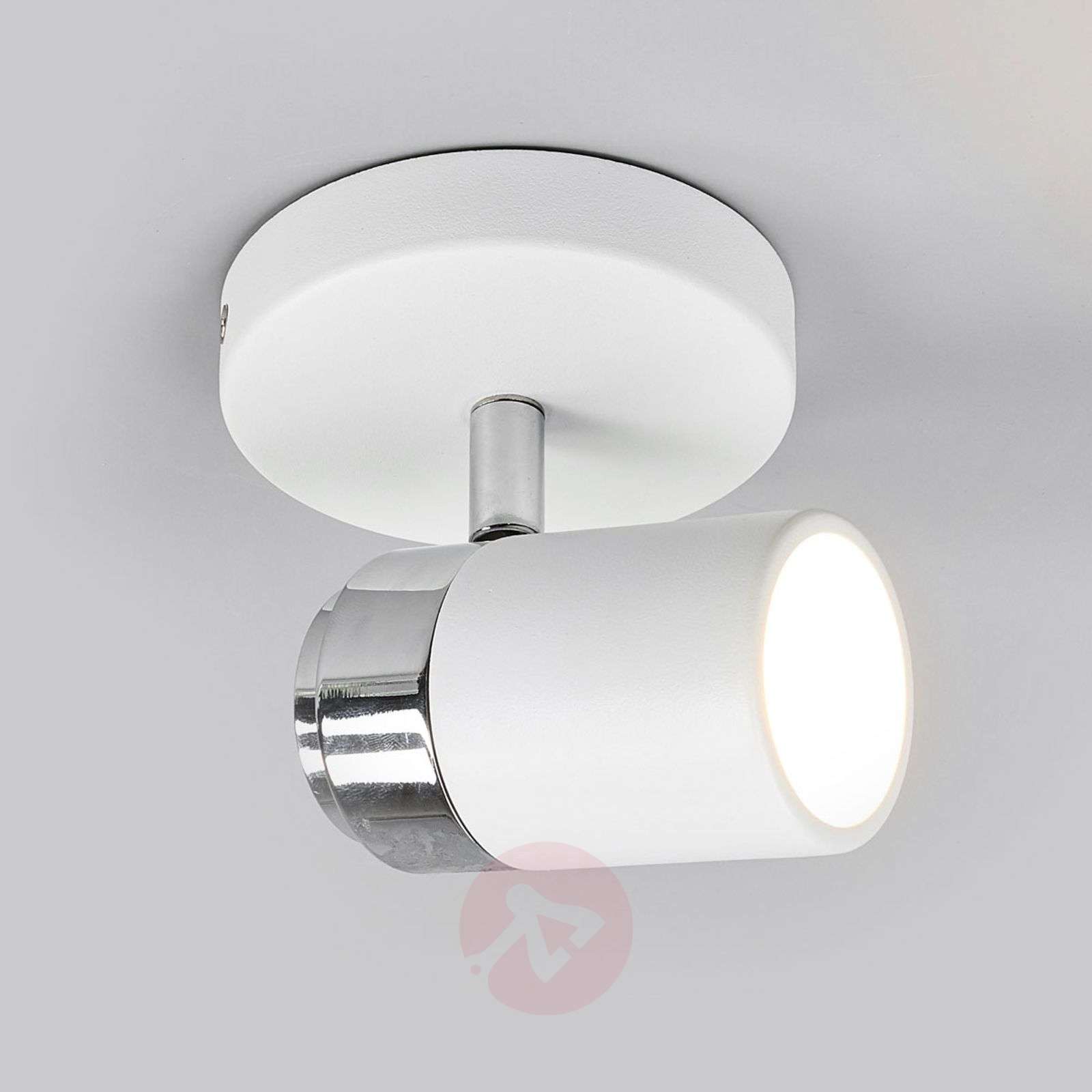 Regulowany reflektor GU10 Kardo do łazienki Kardo to reflektor wyposażony w żarówkę GU10. Przegub pozwala ustawić światło w zależności od potrzeb, a biała powierzchnia nadaje lampie ponadczasowy charakter. Całość uzupełnia lśniący, chromowany pierścień. Lampa ma okrągłe mocowanie i klosz w kształcie cylindra. Dzięki stopniowi ochrony IP44 reflektor nadaje się do stosowania w łazience, gdzie można go montować na ścianach lub sufitach. Klasa efektywności energetycznej: A++