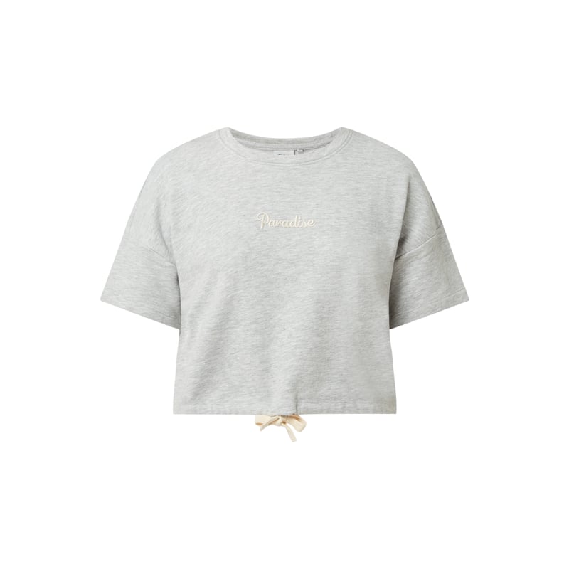Bluza damska ONLY, Bawełna ekologiczna i wiskoza , Pudełkowy krój , Okrągły dekolt , Obniżone ramiona , Krótkie rękawy , Wyhaftowany napis , Tunel na dole , Długość tyłu w rozmiarze S: 43 cm