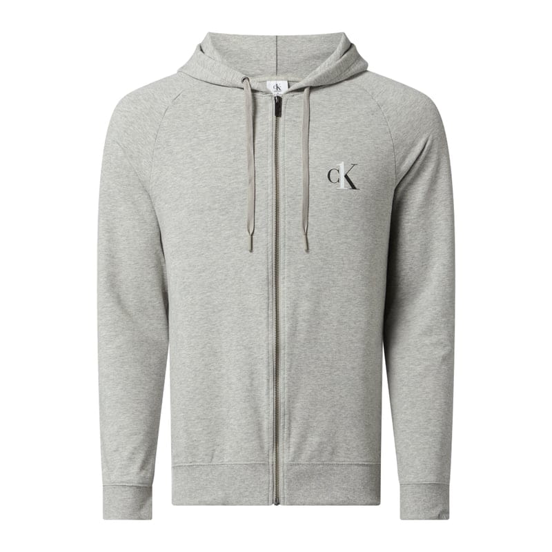 Bluza rozpinana męska CK One, Mieszanka bawełny z dodatkiem streczu , Prosty krój , Kaptur ze sznurkiem , Zamek błyskawiczny , Nadruk z logo na wysokości piersi , Raglanowe rękawy , Prążkowane ściągacze na rękawach i na dole , Długość tyłu w rozmiarze M: 66 cm