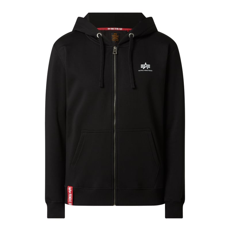 Bluza rozpinana męska Alpha Industries , Mieszanka bawełny , Prosty krój , Kaptur z tunelem , Zamek błyskawiczny , Wpuszczane kieszenie , Prążkowane ściągacze na rękawach i na dole , Logo , Miękka strona wewnętrzna , Długość tyłu w rozmiarze M: 68 cm, Długość rękawa w rozmiarze M: 63 cm