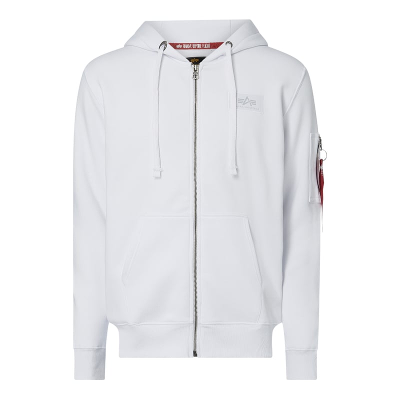 Bluza rozpinana męska Alpha Industries, Mieszanka bawełny , Prosty krój , Kaptur z tunelem , Zamek błyskawiczny , Wpuszczane kieszenie , Kieszeń na rękawie , Prążkowane ściągacze na rękawach i na dole , Nadruk z logo z tyłu , Miękka strona wewnętrzna, Długość tyłu w rozmiarze M: 71 cm, Długość rękawa w rozmiarze M: 64 cm