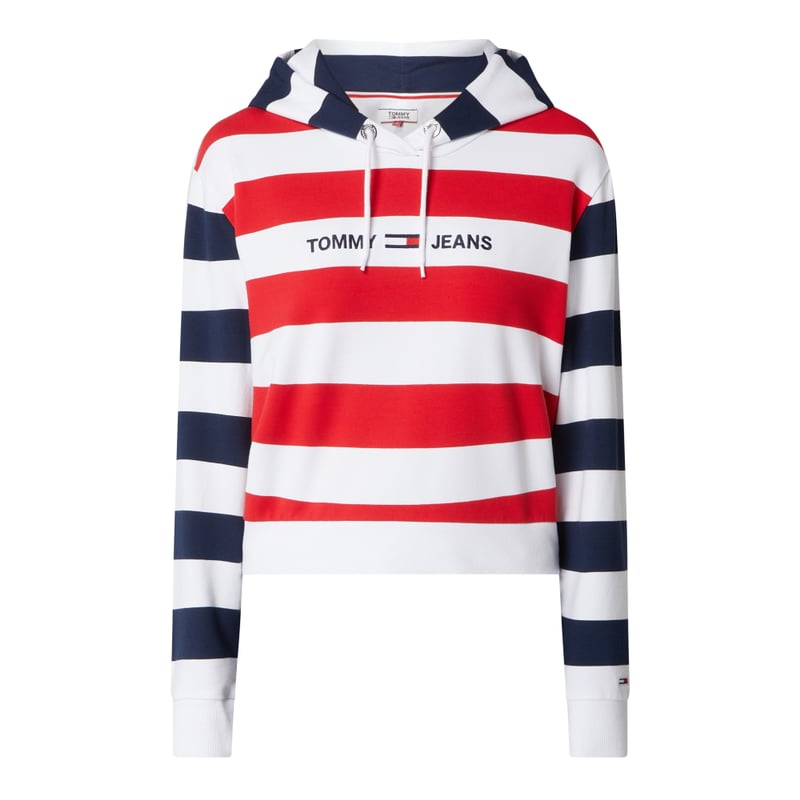 Bluza z kapturem damska Tommy Jeans , Mieszanka bawełny i elastanu , Luźny krój , Wzór w paski , Kaptur z tunelem , Obniżone ramiona , Prążkowane ściągacze na rękawach i na dole , Wyhaftowane logo , Długość tyłu w rozmiarze S: 51 cm
