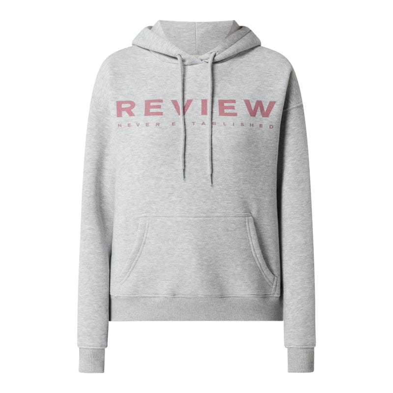 Bluza z kapturem damska REVIEW , Mieszanka bawełny , Luźny krój , Kaptur z tunelem , Obniżone ramiona , Kieszeń kangurka , Prążkowane ściągacze na rękawach i na dole , Logo , Miękka strona wewnętrzna , Długość tyłu w rozmiarze S: 61 cm