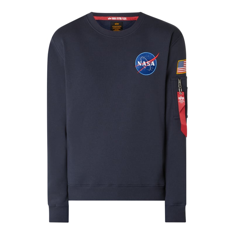 Bluza męska Alpha Industries, Mieszanka bawełny , Prosty krój , Okrągły dekolt , Haft NASA, Kieszeń na zamek błyskawiczny na rękawie , Prążkowane ściągacze na rękawach i na dole , Nadruk ‘Space Shuttle’ z tyłu, Długość tyłu w rozmiarze M: 68 cm , Długość rękawa w rozmiarze M: 66,5 cm