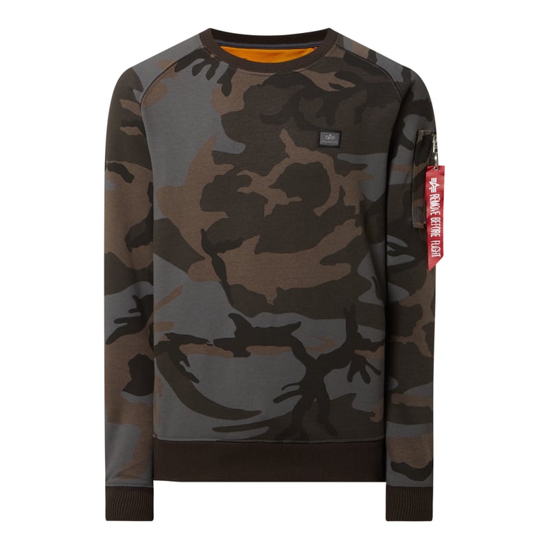 Bluza męska Alpha Industries, Mieszanka bawełny , Prosty krój , Wzór moro, Okrągły dekolt , Naszywka z logo na piersi , Raglanowe rękawy , Prążkowane ściągacze na rękawach i na dole , Długość tyłu w rozmiarze M: 68 cm