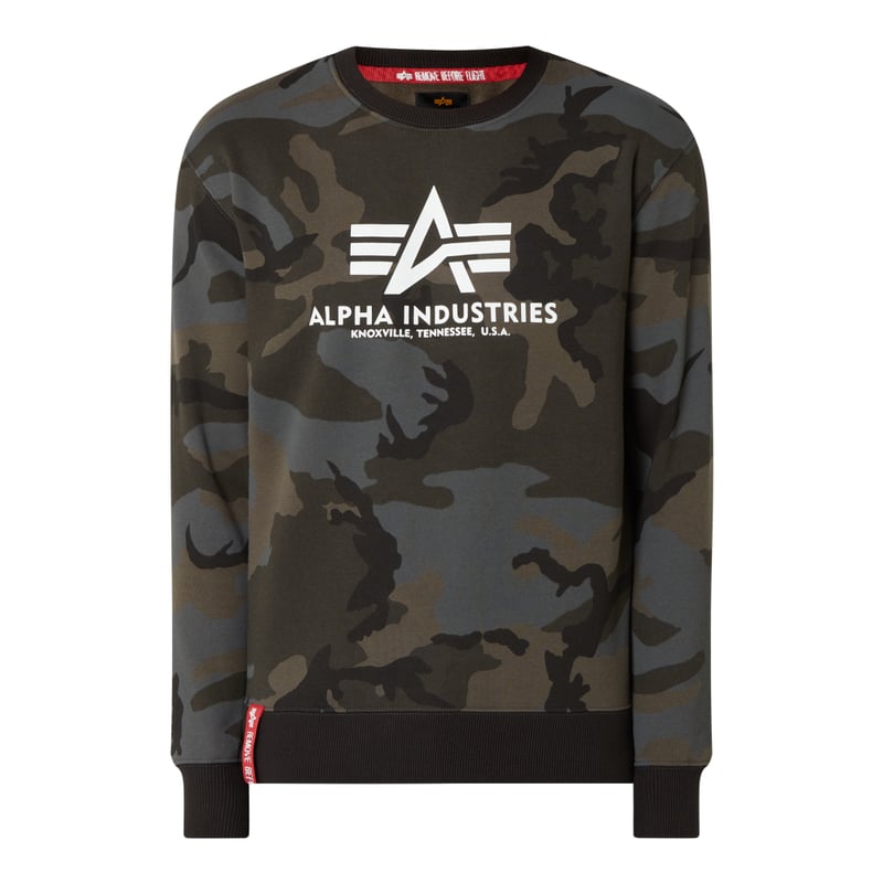 Bluza męska Alpha Industries, Mieszanka bawełny , Luźny krój , Wzór moro , Okrągły dekolt , Nadruk , Logo , Długość tyłu w rozmiarze M: 68 cm , Długość rękawa w rozmiarze M: 65 cm