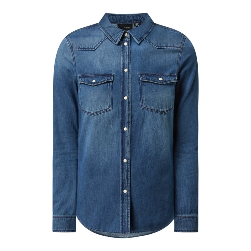 Bluzka jeansowa damska VERO MODA , Czysta bawełna ekologiczna , Taliowany krój, Wykładany kołnierz , Listwa z zatrzaskami , Kieszenie z patką zapinane na zatrzask , Długie rękawy z zapięciem na zatrzask , Ozdobne szwy w stylu western , Długość tyłu w rozmiarze S: 63 cm, Długość rękawa w rozmiarze S: 61 cm