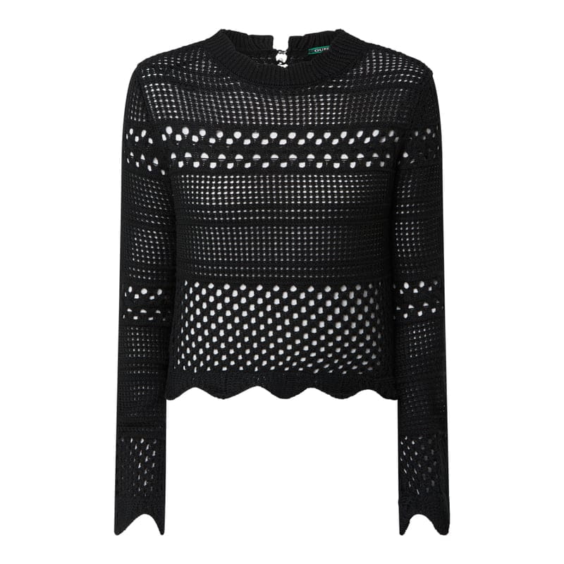 Bluzka damska GUESS, Mieszanka bawełny, Krój krótki , Perforowanie , Okrągły dekolt, Długie rękawy, Brzegi z falbaną, Długość tyłu w rozmiarze S: 42 cm, Długość rękawa w rozmiarze S: 60 cm