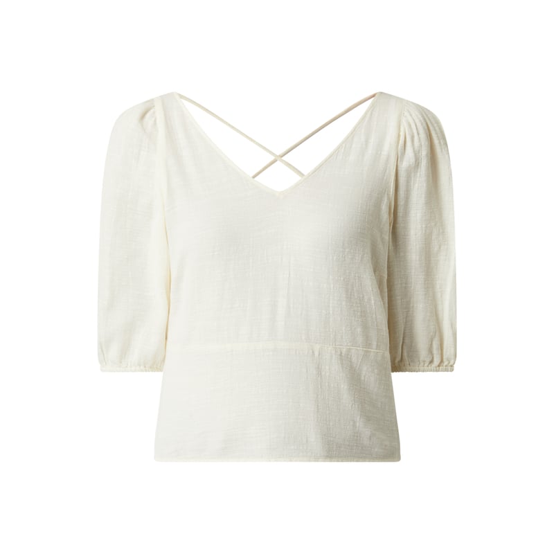 Bluzka damska VERO MODA, Czysta bawełna , Krój krótki , Dekolt w serek , Bufiaste rękawy o dł. 1/2 , Skrzyżowane paski z tyłu , Wycięcie z wiązaniem z tyłu , Długość tyłu w rozmiarze S: 47,5 cm