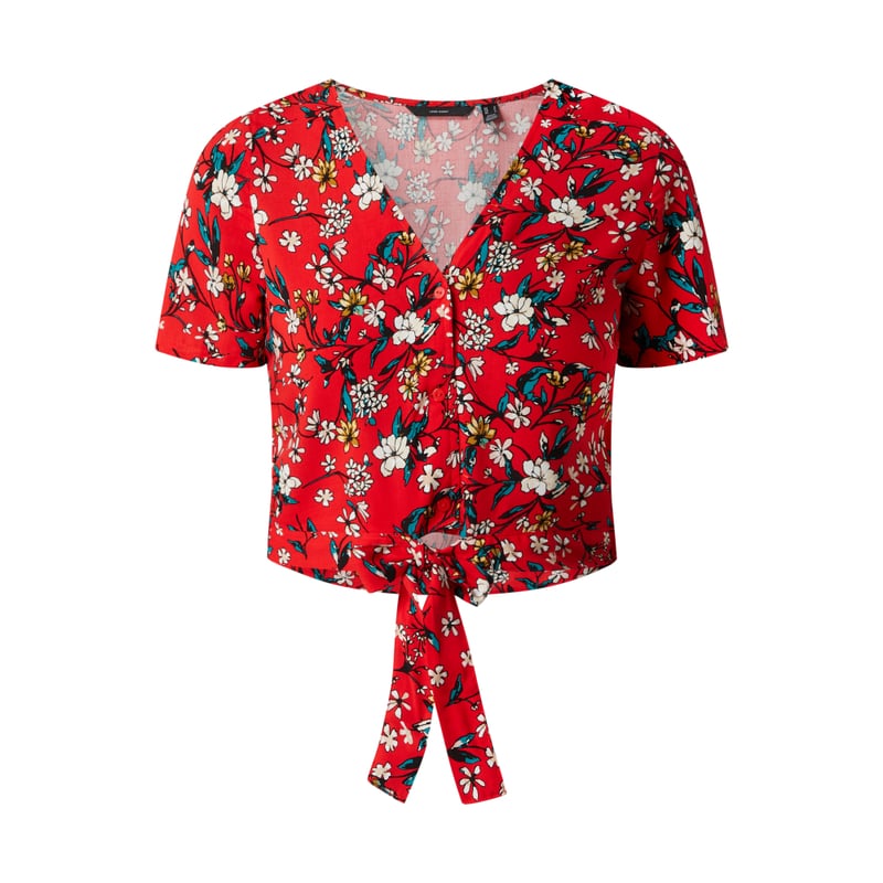 Bluzka damska VERO MODA , Czysta wiskoza , Krój krótki , Kwiatowy wzór , Dekolt w serek , Listwa guzikowa , Wiązany detal na dole , Długość tyłu w rozmiarze S: 46 cm