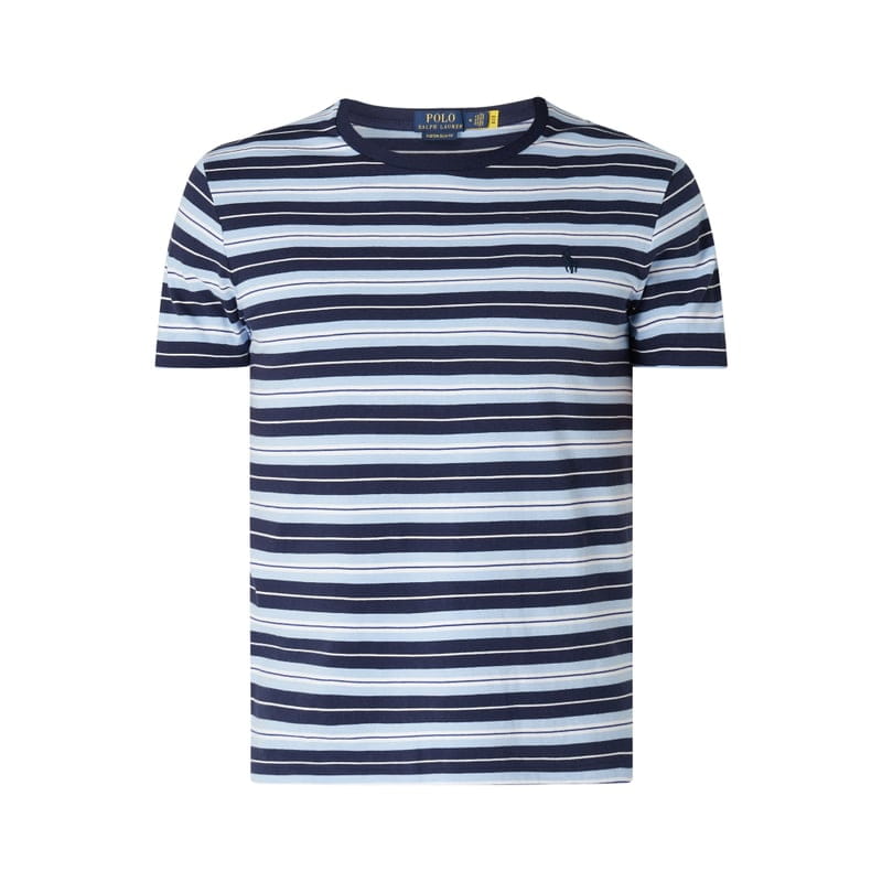 Bluzka męska Polo Ralph Lauren , Czysta bawełna , Krój custom slim fit , Wzór w paski , Okrągły dekolt , Krótkie rękawy , Wyhaftowane logo na piersi , Długość tyłu w rozmiarze M: 66 cm