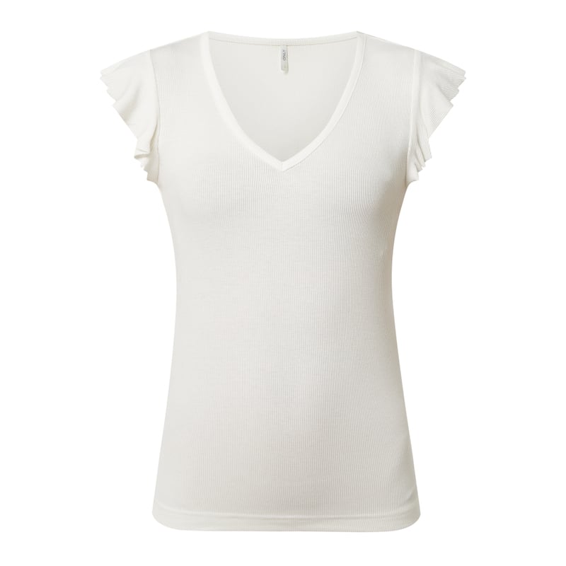 Bluzka damska ONLY, Mieszanka wiskozy i elastanu, Taliowany krój, Dekolt w serek, Krótkie rękawy wolantowe, Długość tyłu w rozmiarze S: 55 cm