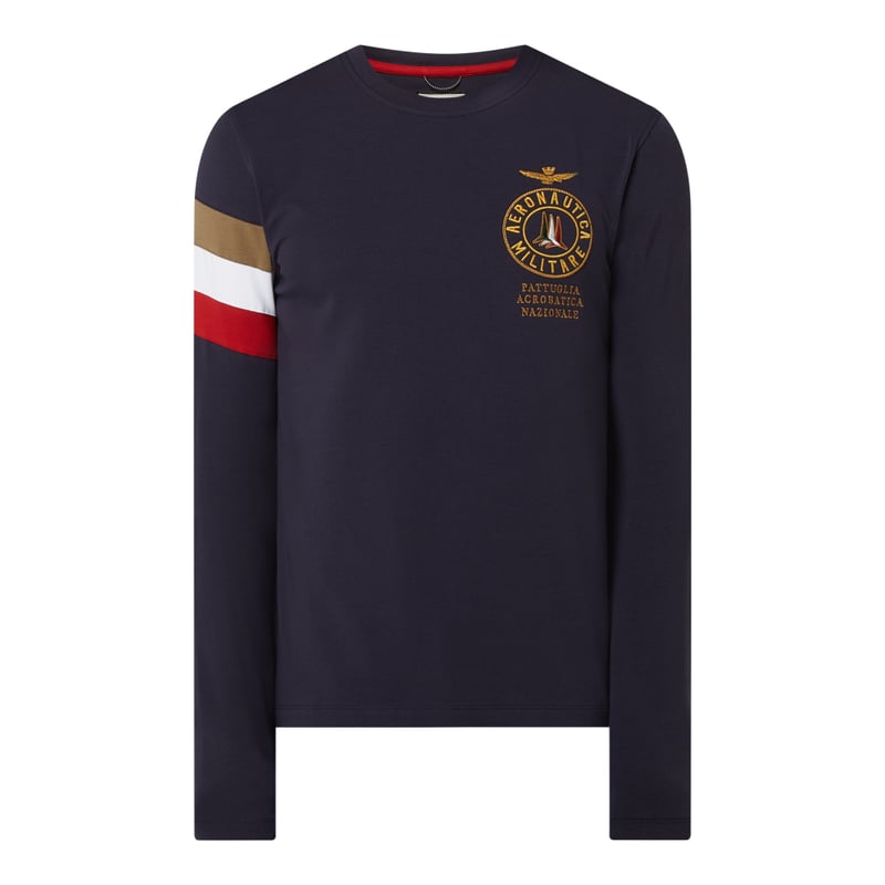 Bluzka z długim rękawem męska Aeronautica Militare, Mieszanka bawełny i elastanu , Prosty krój , Okrągły dekolt , Wyhaftowane logo, Paski w kontrastowym kolorze, Długość tyłu w rozmiarze M: 70 cm , Długość rękawa w rozmiarze M: 67,5 cm