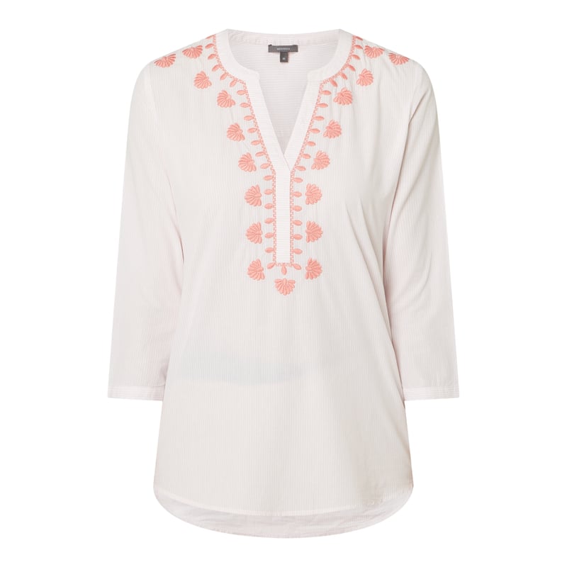 Bluzka damska MONTEGO, Czysta bawełna, Prosty krój, Drobne paski, Kołnierz z lamówką, Rękaw o dł. 3/4, Hafty, Długość tyłu w rozmiarze 36: 66 cm