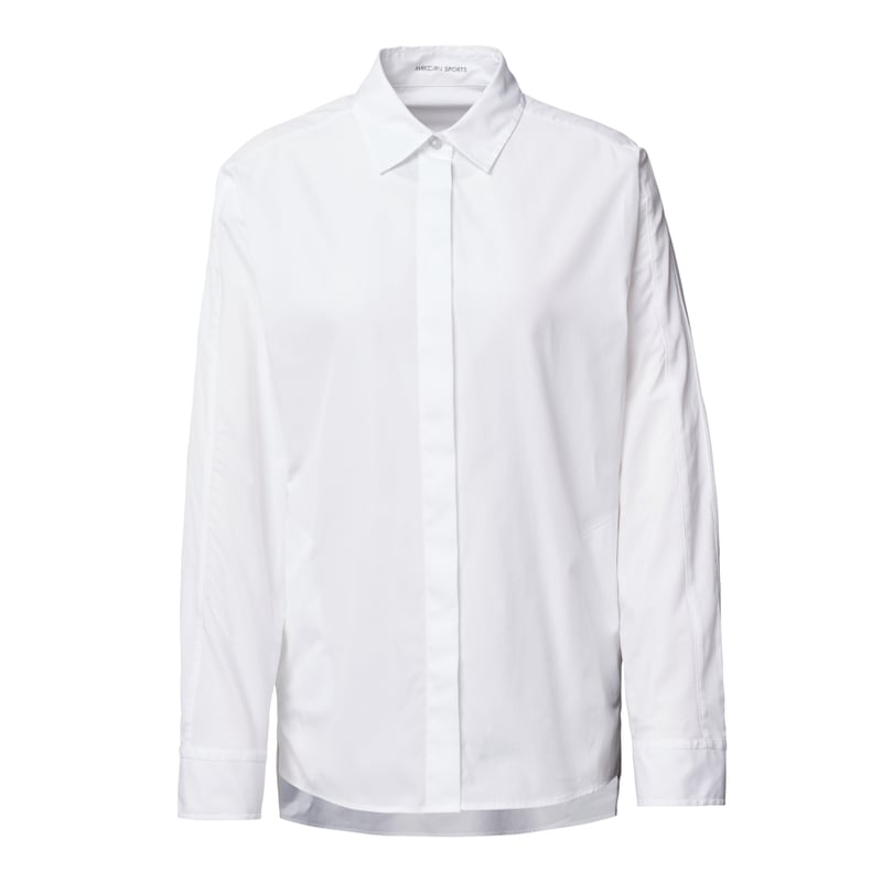 Bluzka damska Marc Cain, Czysta bawełna, Luźny fason, Bluzka z kołnierzem, Kryta listwa guzikowa, Boczne wpuszczane kieszenie, Rozcięcia po bokach, Wydłużony tył z marszczeniami, Detale z logo, Długość tyłu w rozmiarze 36: 72 cm, Długość rękawa w rozmiarze 36: 50 cm