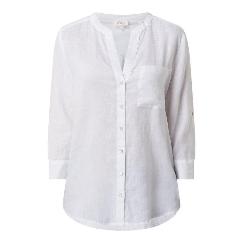 Bluzka damska s.Oliver RED LABEL, Czysty len, Prosty krój, Kołnierz z lamówką, Listwa guzikowa, Regulowana długość rękawa , Rękawy o dł 3/4 z mankietami zapinanymi na dwa guziki , Kieszeń na piersi, Długość tyłu w rozmiarze 36: 70 cm