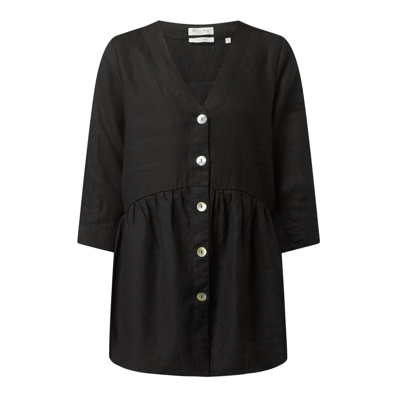 Bluzka damska Christian Berg Women, Czysty len, Luźny krój, Dekolt w serek , Listwa guzikowa , Rękawy o dł. 3/4 z rozcięciami na zakończeniach, Baskinka, Drobne marszczenia, Długość tyłu w rozmiarze 36: 72 cm