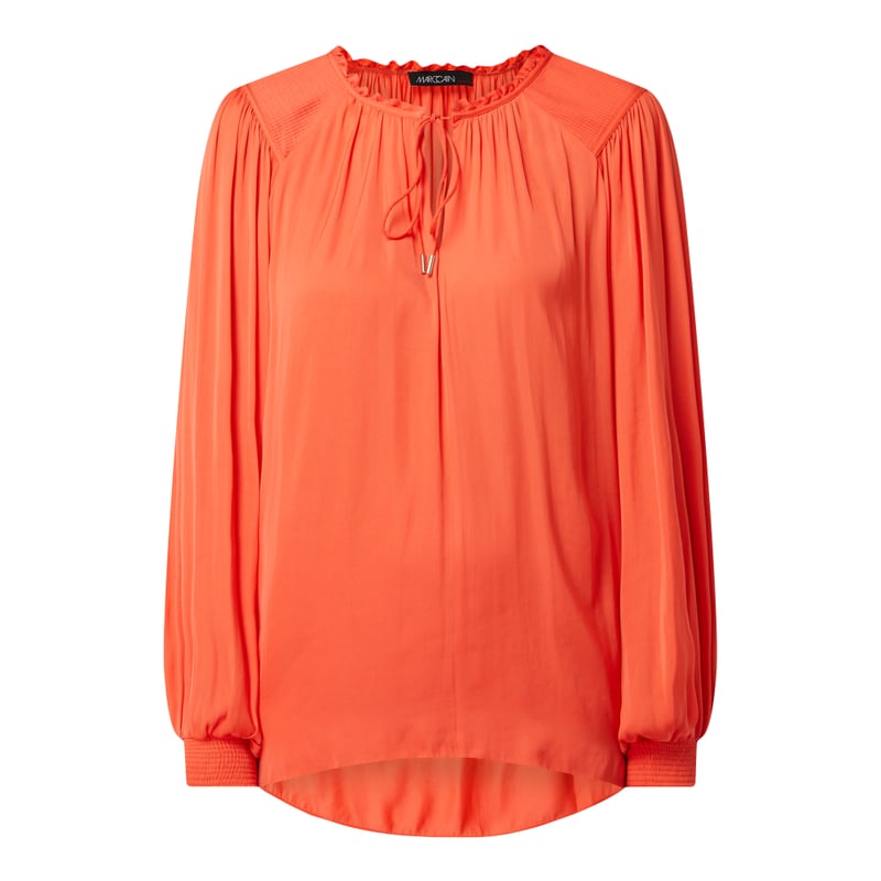 Bluzka damska Marc Cain Collections, Lekki materiał , Luźny krój , Falbaniasta stójka, Wycięcie w kształcie łezki z wiązaniem , Długie rękawy z odznaczającymi się mankietami, Drobne marszczenia, Długość tyłu w rozmiarze 36: 76 cm , Długość rękawa w rozmiarze 36: 63 cm