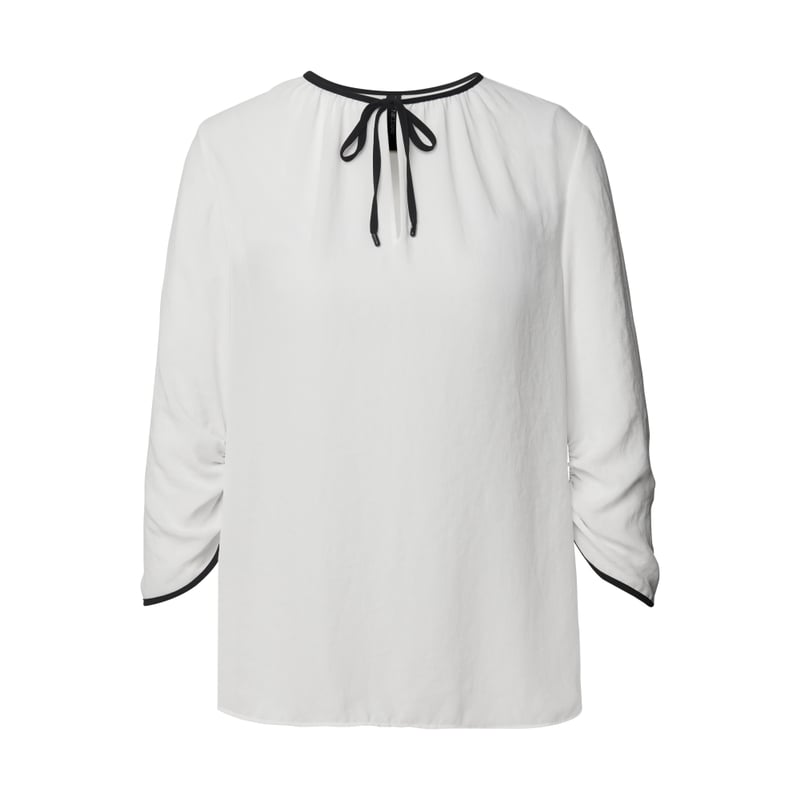 Bluzka damska Marc Cain, Wytrzymały materiał, Luźny fason, Dekolt w serek z wiązaniem w kontrastowym kolorze, Paski w kontrastowym kolorze, Rękawy o dł. 3/4 z marszczeniami, Długość tyłu w rozmiarze 36: 61 cm, Długość rękawa w rozmiarze 36: 47 cm