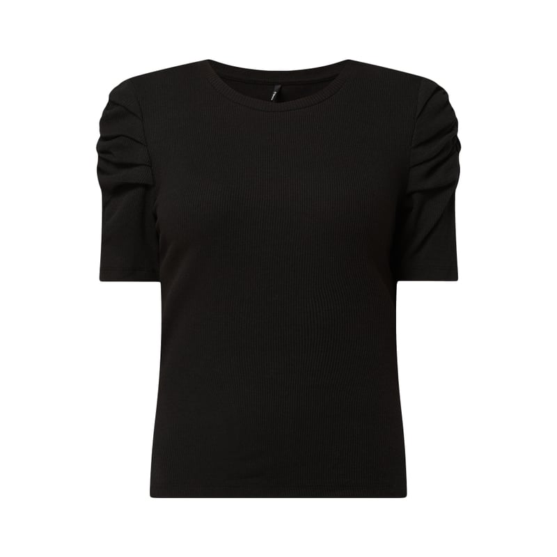 Bluzka damska ONLY, Mieszanka wiskozy i bawełny, Wąski krój, Drobne prążkowanie, Okrągły dekolt, Krótkie rękawy z marszczeniami, Długość tyłu w rozmiarze S: 52 cm
