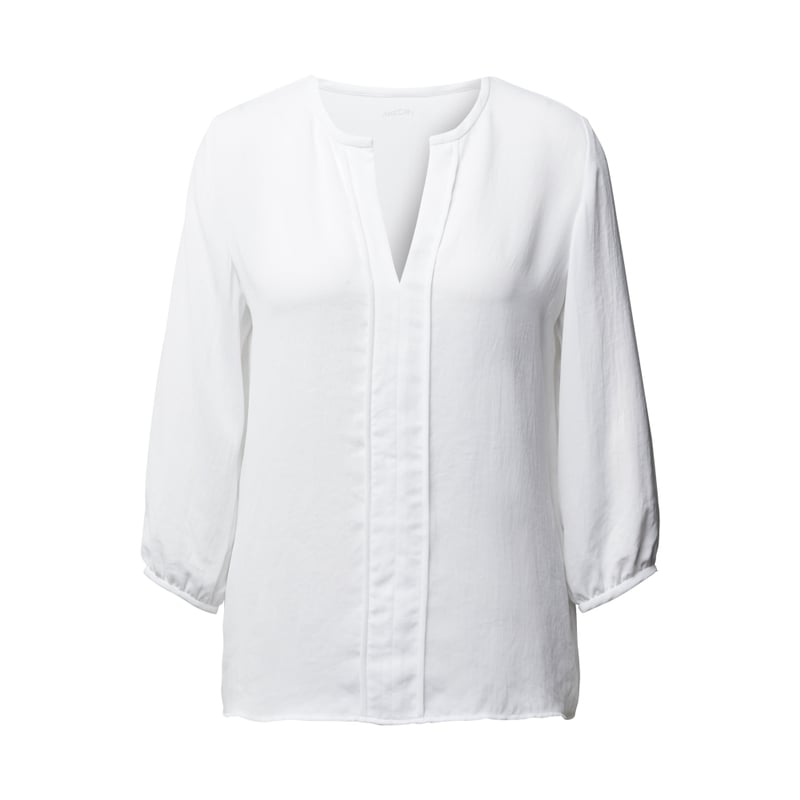 Bluzka damska Marc Cain Essentials, Lekki materiał, Luźny krój, Dekolt w serek, Ozdobne wypustki z przodu, Rękaw 3/4 z wykończeniem z wypustkami, Długość tyłu w rozmiarze 36: 61 cm