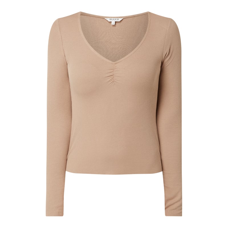 Bluzka damska REVIEW, Mieszanka wiskozy i elastanu , Taliowany krój, Prążkowana faktura , Dekolt w serek z elastycznym marszczeniem , Długie rękawy , Długość tyłu w rozmiarze S: 48 cm , Długość rękawa w rozmiarze S: 60,5 cm