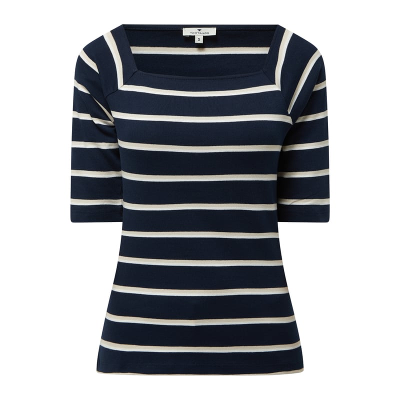 Bluzka damska TOM TAILOR, Mieszanka bawełny i elastanu , Prosty krój , Wzór w paski , Prostokątny dekolt, Rękaw o dł. 1/2 , Better Cotton Initiative, Długość tyłu w rozmiarze S: 54 cm