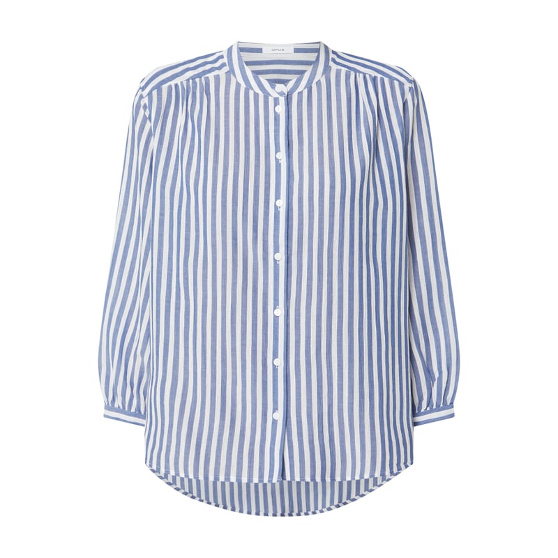 Bluzka damska OPUS, Mieszanka wiskozy i bawełny, Luźny krój , Wzór w paski , Wąska stójka , Rękaw o dł. 3/4 z zakończeniem zapinanym na guzik , Wydłużony tył , Marszczenia , Długość tyłu w rozmiarze 36: 72 cm