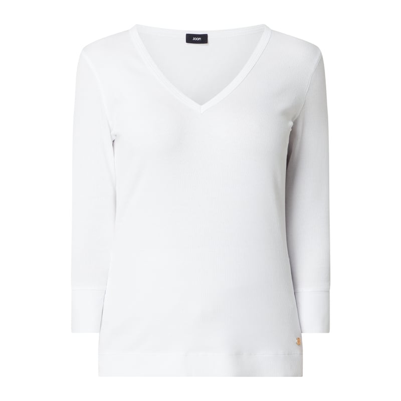 Bluzka damska JOOP!, Mieszanka bawełny i elastanu , Wąski krój , Drobno prążkowana faktura , Dekolt w serek , Rękaw o dł. 7/8 , Długość tyłu w rozmiarze 36: 58 cm