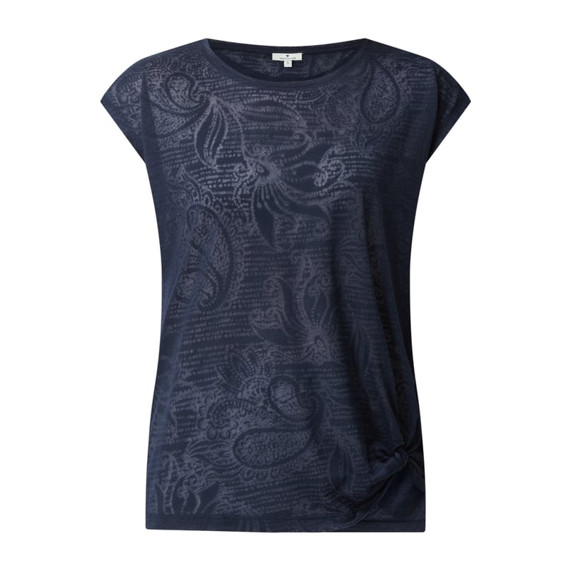 Bluzka damska TOM TAILOR, Mieszanka materiałów z dodatkiem wiskozy, Taliowany krój, Efekt podpalania, Okrągły dekolt, Krótkie, ukośnie skrojone rękawy, Wiązany detal na dole, Długość tyłu w rozmiarze S: 58 cm