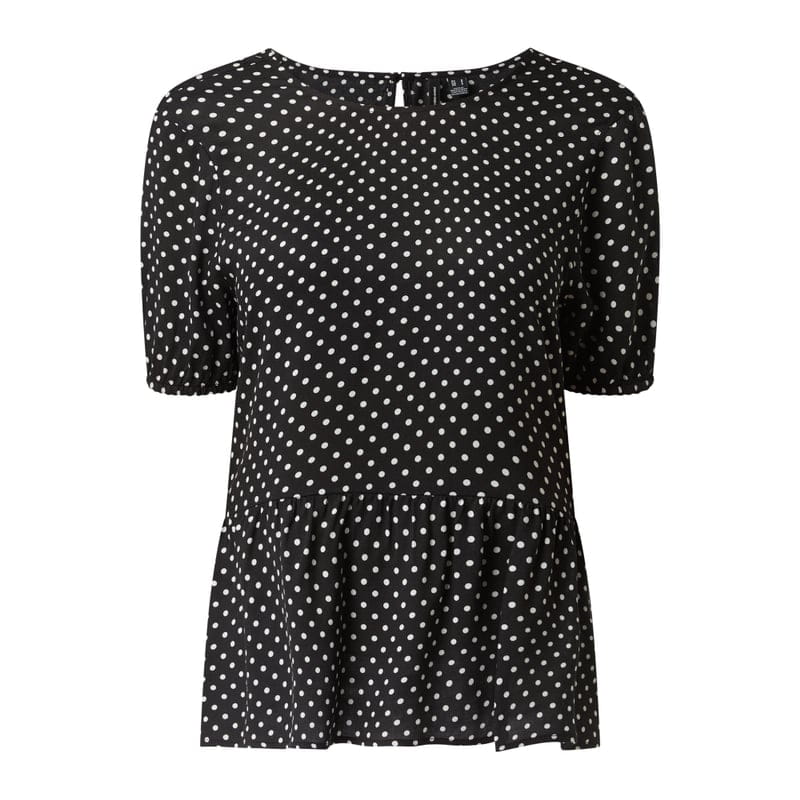 Bluzka damska VERO MODA , Czysta wiskoza, LENZING™ ECOVERO™, Lekko rozkloszowany krój, Wzór w kropki, Okrągły dekolt, Krótkie rękawy z elastycznym wykończeniem, Dół obszyty falbaną, Wycięcie z tyłu zapinane na guzik, Długość tyłu w rozmiarze S: 55 cm