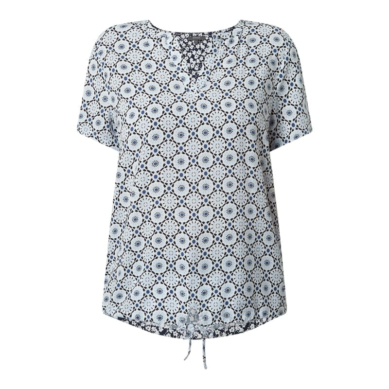 Bluzka damska MONTEGO , Czysta wiskoza , Taliowany krój , Ornamentalny wzór , Kołnierz z lamówką , Tunel z wiązanym detalem na dole, Długość tyłu w rozmiarze 36: 59,5 cm