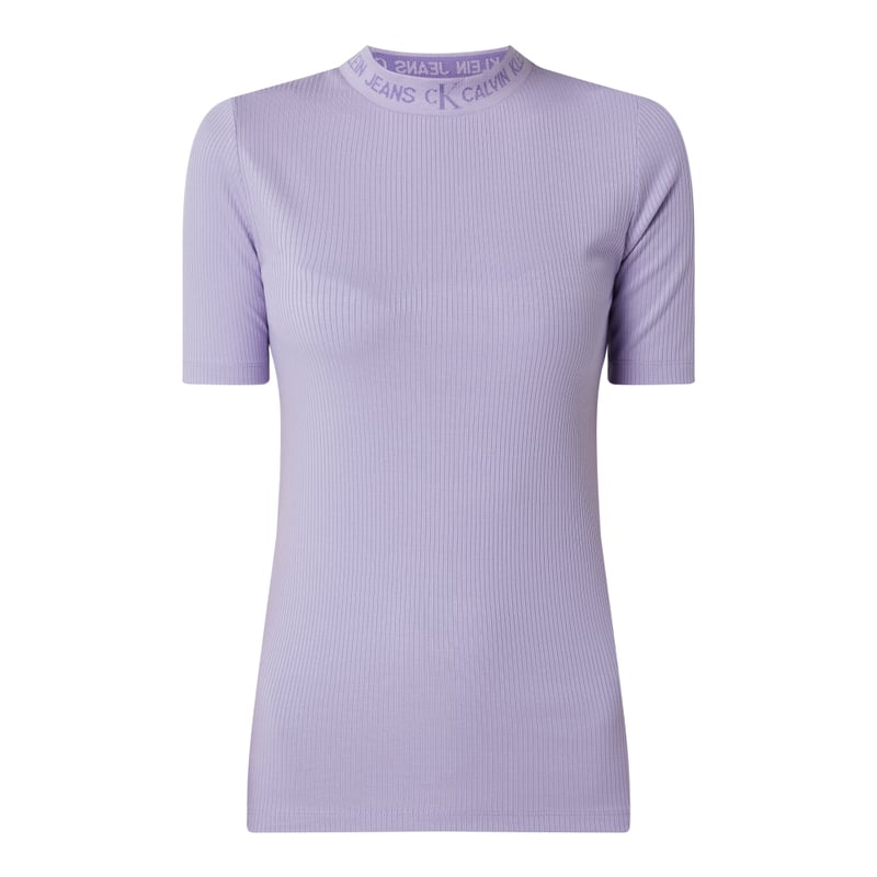 Bluzka damska Calvin Klein Jeans , Mieszanka wiskozy i elastanu , Wąski krój , Prążkowana faktura , Stójka , Logo , Długość tyłu w rozmiarze S: 60 cm