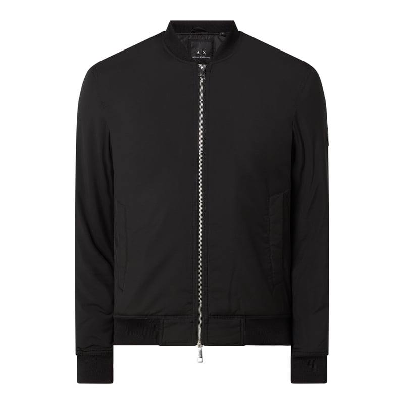 Bluzon męski Armani Exchange , Wytrzymały materiał , Luźny krój, Stójka z prążkowanego ściągacza , Zamek błyskawiczny dwustronny , Wpuszczane kieszenie , Prążkowane wykończenia , Nadruk z logo , Długość tyłu w rozmiarze M: 66 cm, Szerokość ramion w rozmiarze M: 48 cm, Długość rękawa w rozmiarze M: 67 cm