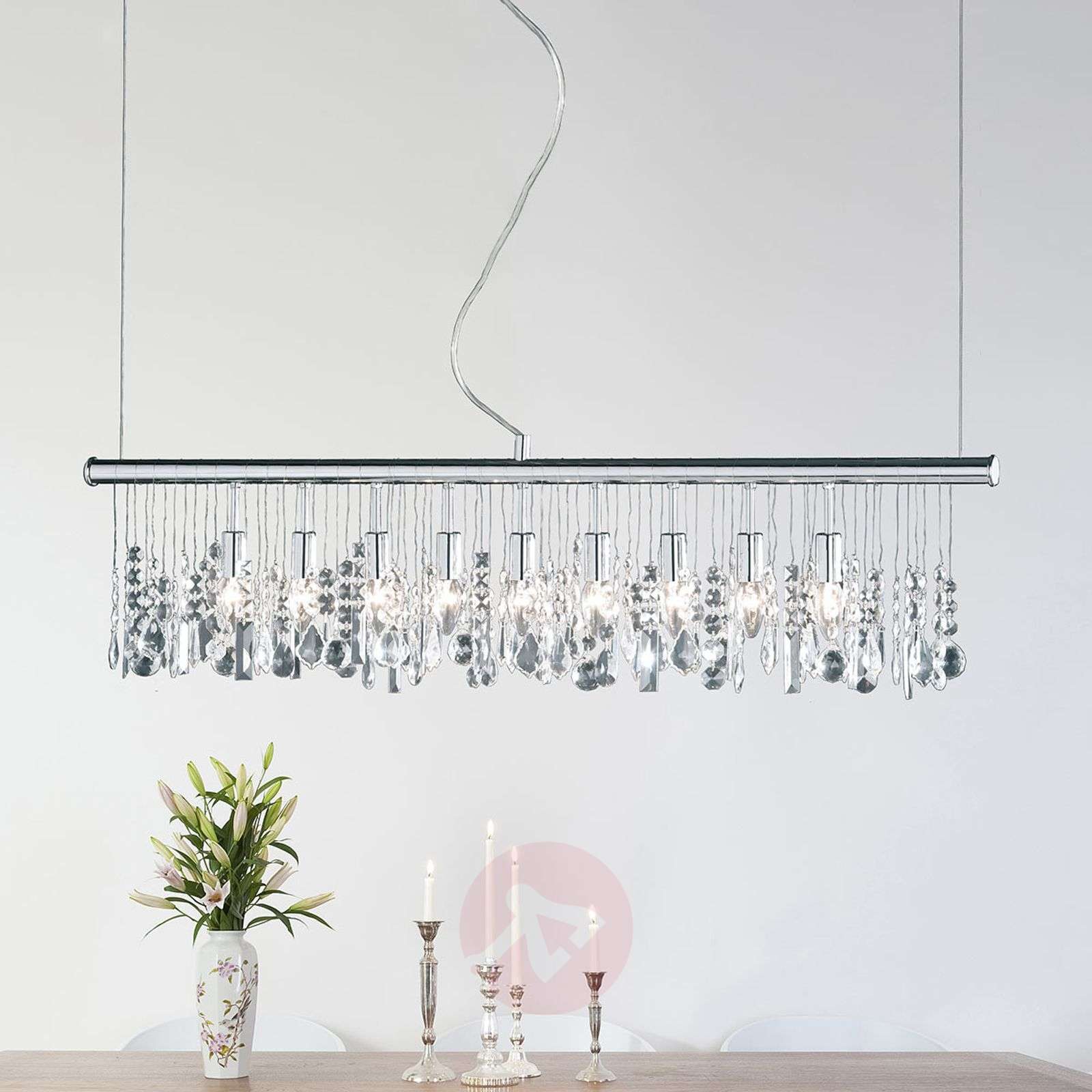 Pełna blasku lampa wisząca CRYSTAL z dekoracyjnymi szklanymi zawieszkami. Lampa wisząca CRYSTAL zachwyca promiennym światłem i efektem świetlnym jako atrakcyjna dekoracja nad stołem w jadalni lub ławą. Pięć lub dziewięć źródeł światła ukrywa się pomiędzy dwudziestoma lub trzydziestoma sześcioma szklanymi zawieszkami, które załamują światło w różnorodny sposób i tworząc iskrzące efekty w otoczeniu. Także belka w kolorze błyszczącego chromu ze swoimi oprawami odbija światło i wspomaga świecący efekt. Klasa efektywności energetycznej: A++