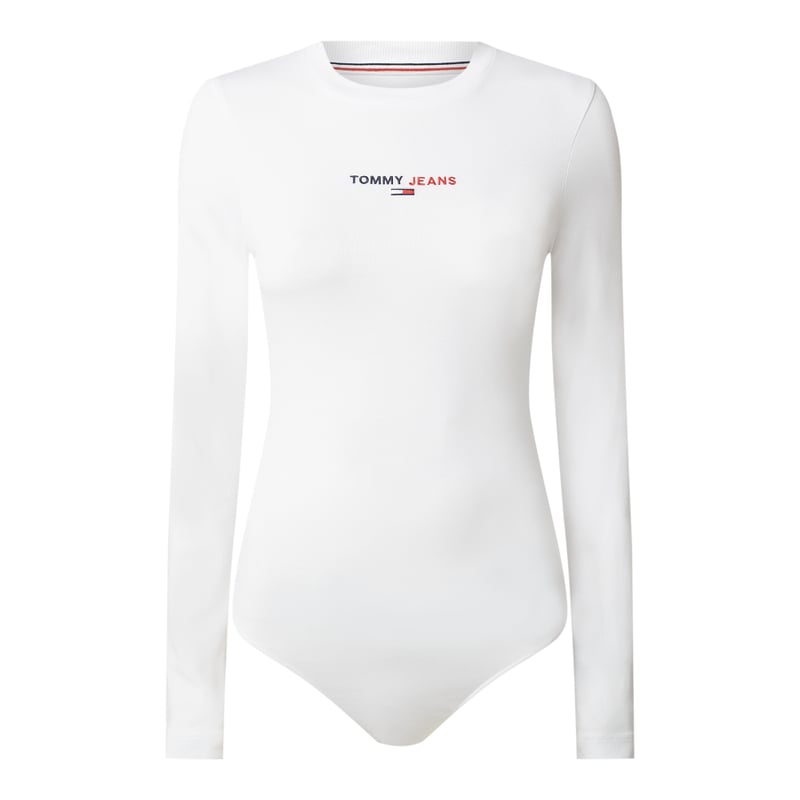 Body damskie Tommy Jeans , Mieszanka bawełny i elastanu , Dopasowany krój, Okrągły dekolt , Dół z zatrzaskami, Logo, Długość tyłu w rozmiarze S: 72 cm, Długość rękawa w rozmiarze S: 62 cm