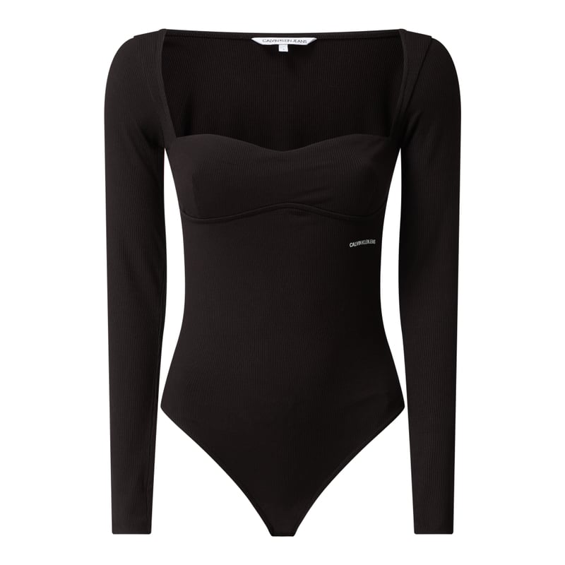 Body damskie Calvin Klein Jeans, Mieszanka wiskozy i elastanu , Dopasowany krój , Prążkowana faktura , Prostokątny dekolt , Długie rękawy , Nadruk z logo , Dół z zatrzaskami, Długość tyłu w rozmiarze S: 67 cm, Długość rękawa w rozmiarze S: 65 cm