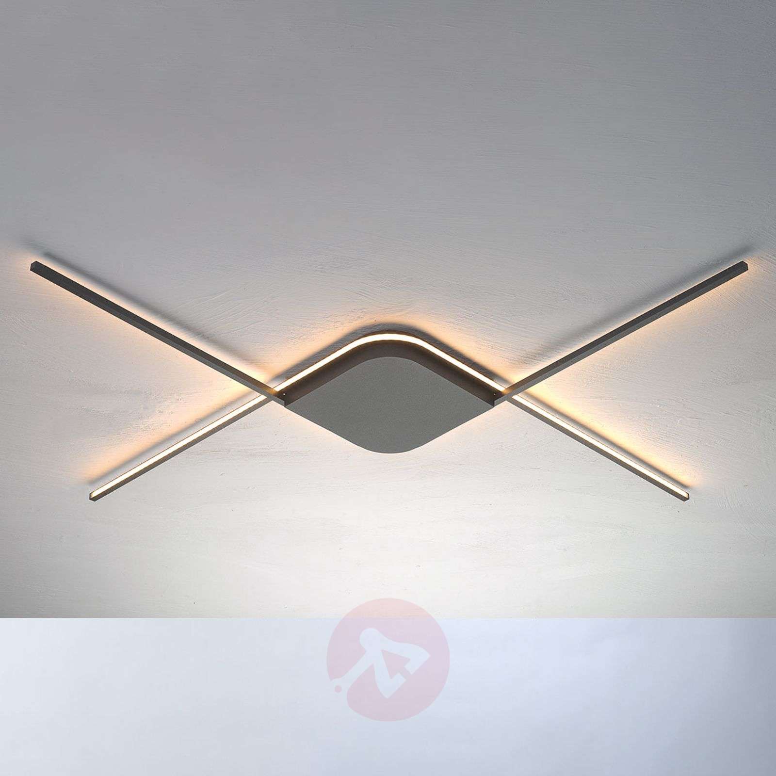 Ściemniana lampa sufitowa LED Less - mniej to czasami więcej Minimalistyczne wzornictwo niezwykłej lampy sufitowej Less LED pasuje do jej nazwy: duża moc świetlna jest generowana przez taśmę LED, która została wbudowana w cienkie aluminiowe pręciki. Pręciki te zawijają się wokół rozety sufitowej w kształcie rombu, tworząc na końcu cztery źródła światła skierowane w różnych kierunkach. Niezwykle płaska lampa sufitowa ma niewielki korpus, ale pomimo tego dzięki mocnym diodom LED zapewnia wystarczające oświetlenie ogólne. Lampa sufitowa Less LED jest idealna dla miłośników minimalistycznego stylu. Światło o barwie ciepłej bieli można również ściemniać. Wysokiej jakości lampa sufitowa LED Less pochodzi z kolekcji odenwaldzkiego producenta Bopp Leuchten i jest produkowana w Niemczech. Klasa efektywności energetycznej: A+