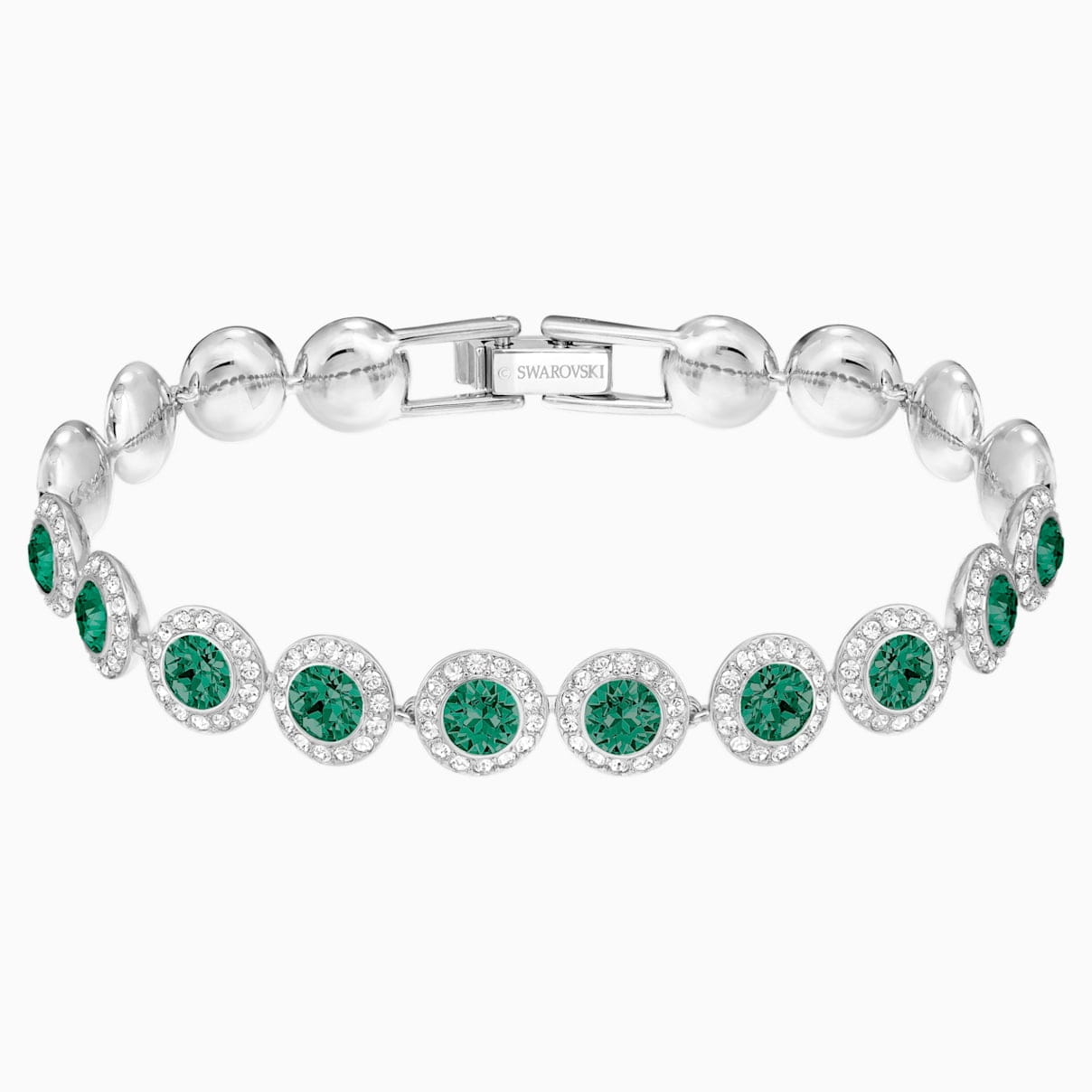 Ponadczasowy styl i piękno w czystej postaci. Tę powlekaną rodem bransoletkę ozdobiono pasem okrągłych kryształów w wyrazistym zielonym odcieniu ze lśniącą szklaną oprawę pavé. Doskonale prezentuje się z innymi elementami kolekcji Angelic. Możesz też zestawić ją z szeroką bransoletą lub zegarkiem Swarovskiego, tworząc stylizację wpisującą się w najmodniejsze trendy.