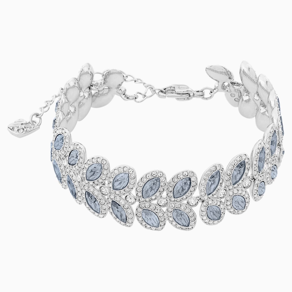Wysublimowana bransoletka powlekana rodem, przyciągająca wzrok blaskiem bezbarwnych kryształów w subtelnej niebieskiej tonacji. Elementy w kształcie listków ozdobiono kryształową oprawą pavé. Najwyższy jubilerski kunszt wykonania.