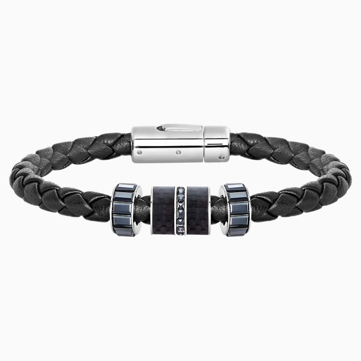 Pleciona bransoletka z czarnej skóry utrzymana w modnym męskim stylu. Projekt Swarovskiego z zapięciem powlekanym rodem z przodu ozdobiony trzema paciorkami z bezbarwnego kryształu i metalu z czarną powłoką PVD. Model dostępny w dwóch rozmiarach: M oraz L.