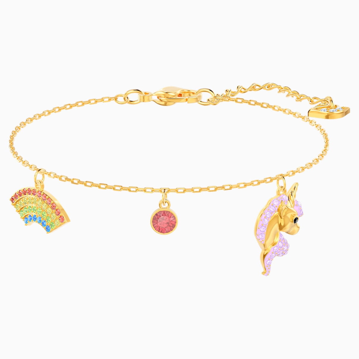 Poczuj się jak księżniczka z bajki, wybierając tę bransoletkę z jednorożcem dostępną tylko w sklepie internetowym. Połyskujący złocistym blaskiem model zdobi wysadzana kryształami kolorowa tęcza i jednorożec. Ten urokliwy i figlarny dodatek do noszenia na co dzień będzie też idealnym pomysłem na prezent.