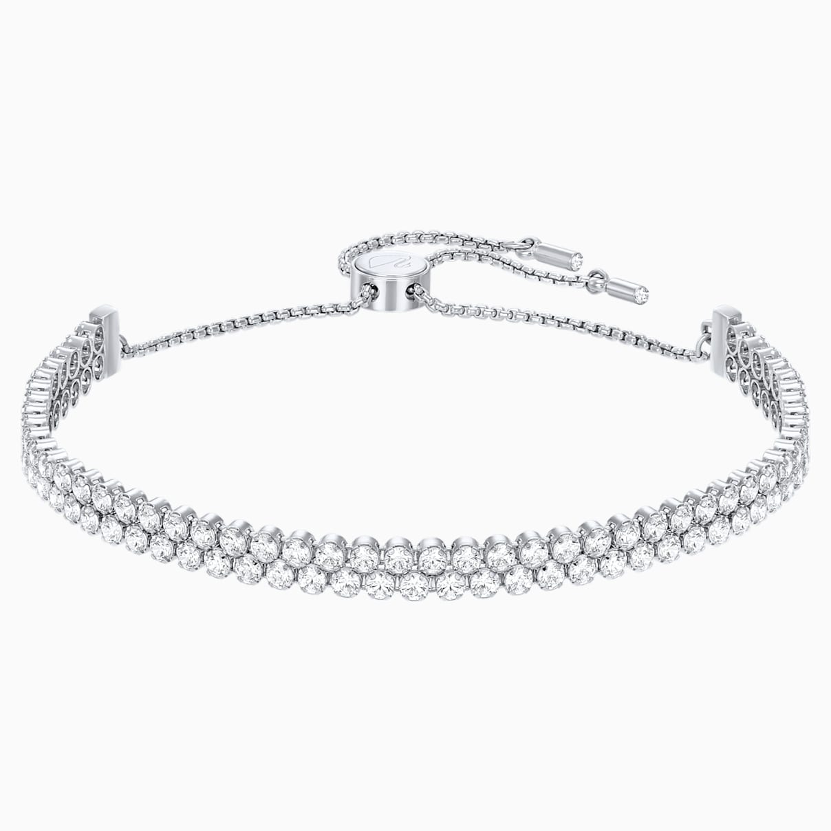 Ta ponadczasowa bransoletka powlekana rodem to idealny prezent dla miłośniczek błyskotek. Dwa delikatne pasma bezbarwnych kamieni osadzone są w nowej formie taśmy kryształowej. Wykończona jest innowacyjnym, przesuwanym zapięciem kulkowym, które zapewnia łatwość regulacji rozmiaru i idealne dopasowanie. Urocza i subtelna, a zarazem zachwycająco elegancka. Zestaw ją z zegarkiem Swarovski na dzień, a wieczorem zadaj szyku, łącząc ją z kontrastującymi bransoletkami.