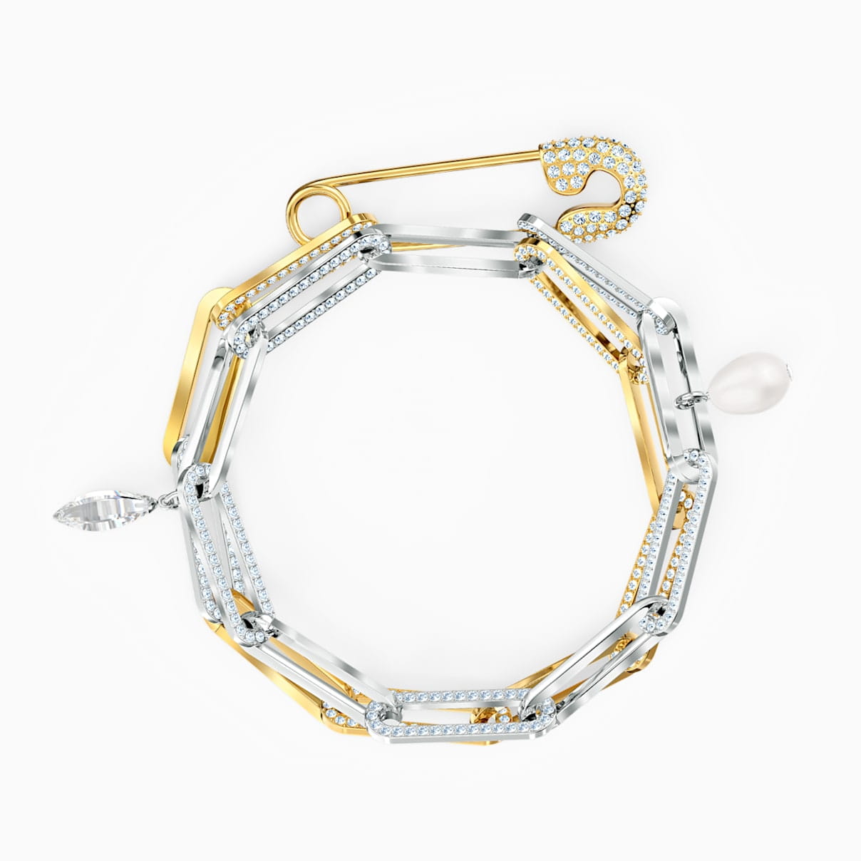 This Swarovski bracelet is versatile and striking. Held together by a crystal-embellished safety pin, the design features a Crystal Pearl and a sparkling crystal dangling from the mixed metal finish chains. Use it to create multiple looks for different outfits.