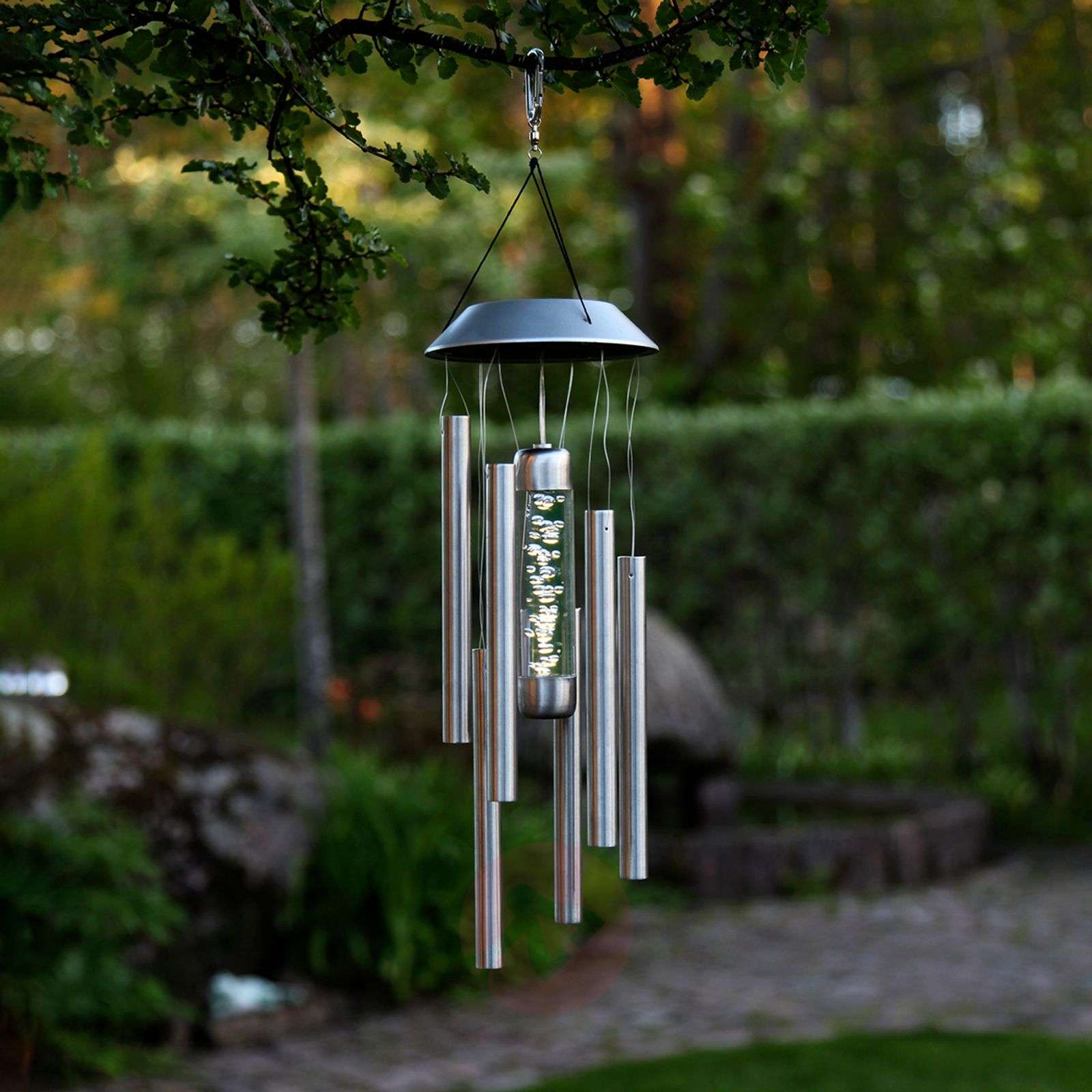 Dzwonek wietrzny Bubbly ze stali szlachetnej, z lampą solarną Gdy sześć stalowych rurek zaczyna obijać się o siebie pod wpływem wiatru, dookoła rozlegają się delikatne odgłosy, przypominające melodię kurantów. To jednak nie wszystko - gdy tylko zapada zmrok, w akrylowej tulejce umieszczonej między rurkami ze stali szlachetnej rozbłyska światło LED, pięknie podświetlające pęcherzyki powietrza. Niezbędna dla LED energia pochodzi z modułu solarnego osadzonego w zawieszeniu. Moduł energią słoneczną ładuje wbudowany w produkcie akumulator. Zmagazynowana w akumulatorze energia w zależności od poziomu naładowania wystarcza nawet na 6 godzin.