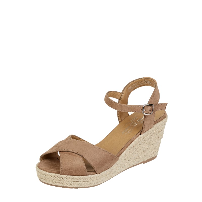 Buty na koturnie damskie TOM TAILOR, Imitacja skóry welurowej , Zaokrąglony czubek , Skrzyżowane paski , Pasek ze sprzączką, Koturn z obszyciem w kontrastowym kolorze z efektem plecionki , Gumowa podeszwa , Gładka wkładka , Wysokość obcasa w rozmiarze 39: 8 cm
