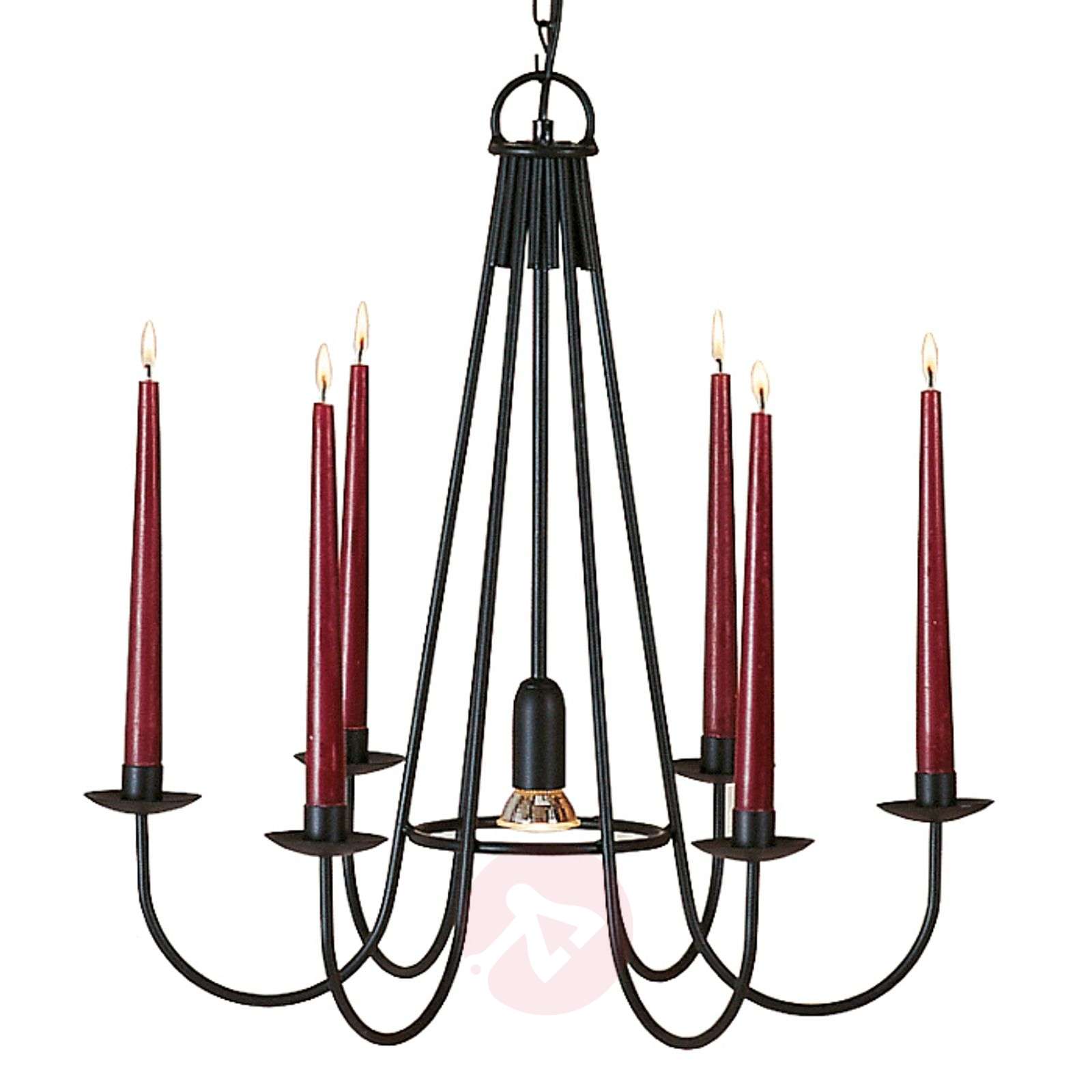 Romantyczny żyrandol świeczkowy COUNTRY ze świecami i halogenową lampką punktową Żyrandol świeczkowy COUNTRY z żelaza lakierowanego w czarnym matowym kolorze wypełnia wnętrze romantycznym nastrojem. Dostawa tego sześcioramiennego żyrandola obejmuje także ciemnoczerwone woskowe świece oraz bluszczową dekorację. Odpowiedni nastrój niezależnie od palących się świec zapewnia umieszczona pośrodku halogenowa lampka punktowa. Te wysokiej jakości lampy europejskiego pochodzenia są produkowane ręcznie z naturalnych materiałów i charakteryzują się wysoką jakością. Niewielkie ilości produkcyjne pozwalają na zachowanie indywidualności, zagwarantowanie różnorodności oraz tworzenie wyjątkowych produktów. Klasa efektywności energetycznej: A++