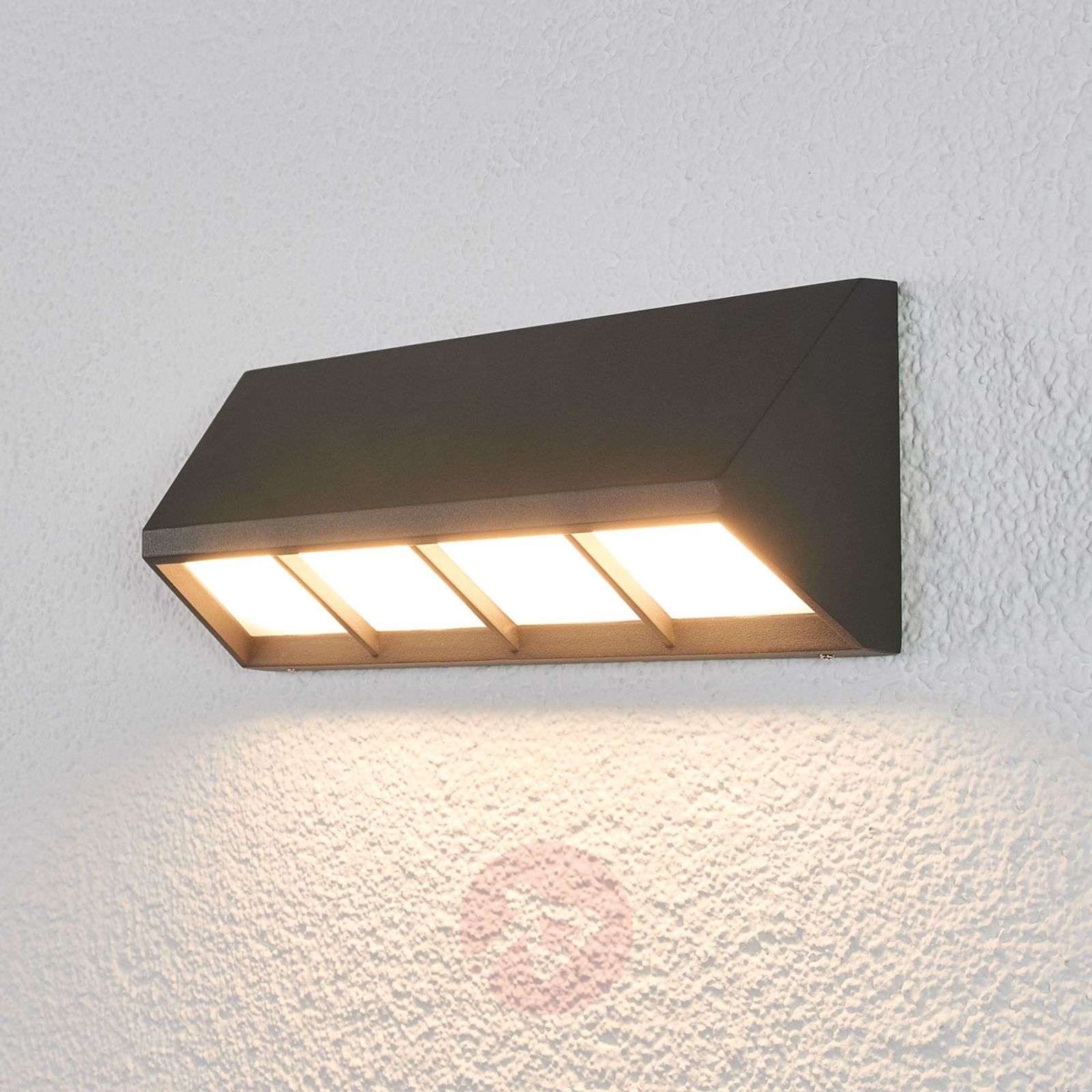 Emitujący światło o barwie ciepłej bieli kinkiet zewnętrzny LED Cedrick z wylotem światła skierowanym w dół Cedrick jest wykonany głównie z aluminium i ma ciemnoszarą powierzchnię, która nadaje lampie dyskretny i ponadczasowy wygląd. Dzięki temu tę lampę zewnętrzną ścienną LED można łatwo zintegrować w wielu różnych otoczeniach. Ze względu na ukośną konstrukcję lampy światło LED jest skierowane ku dołowi i nie powoduje efektu oślepiania. Kinkiet zewnętrzny LED można doskonale wykorzystać na przykład do oświetlenia numeru domu, aby nawet po zapadnięciu zmroku goście mieli pewność, że dotarli we właściwe miejsce. Klasa efektywności energetycznej: A+