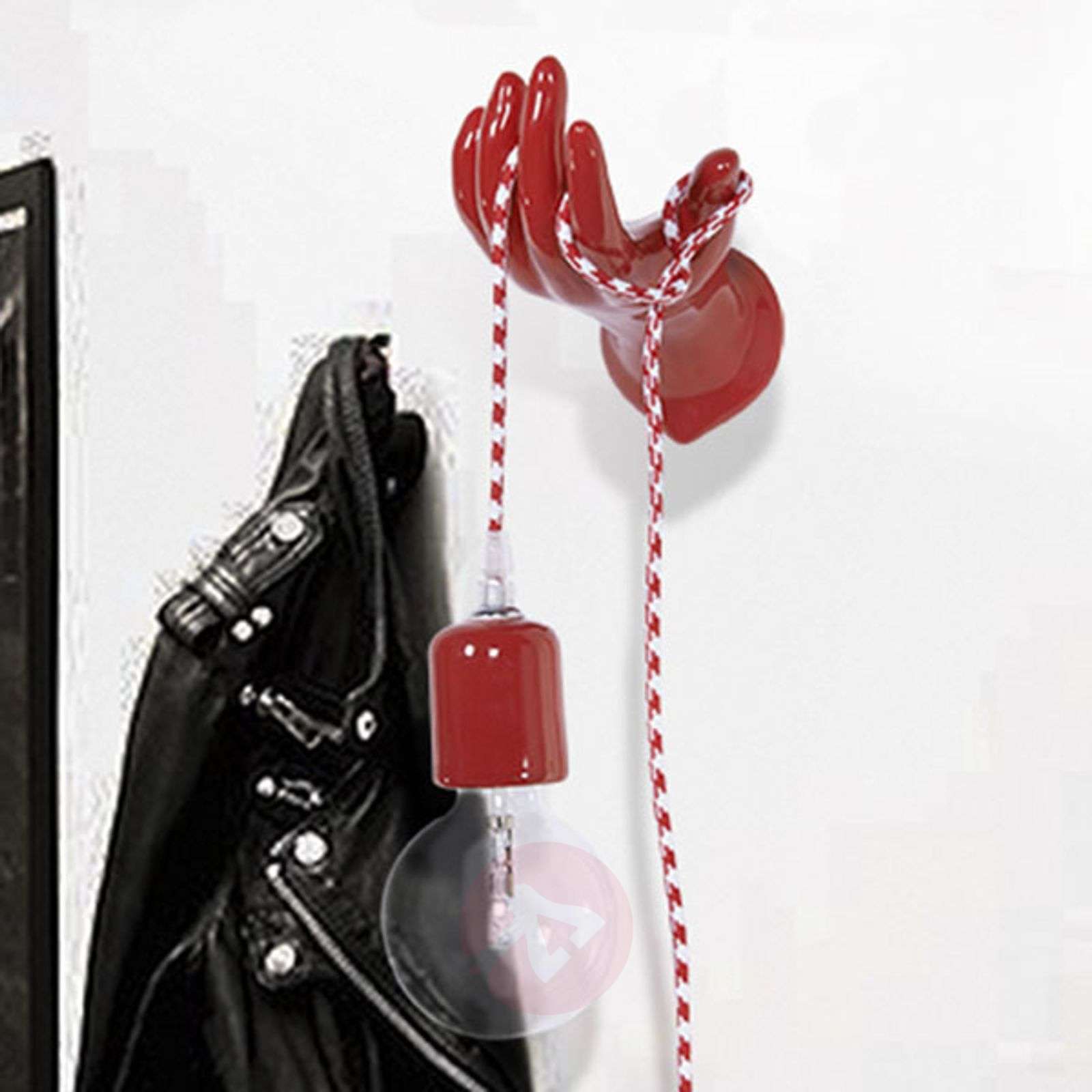 Oryginalna lampa ścienna A181 RSS w kształcie dłoni Konstrukcja lampy ściennej A181 RSS jest bardzo oryginalna: ręka, która zdaje się wystawać ze ściany. wokół palców jest owinięty czerwono-biały tekstylny kabel, z którego końca zwisa oprawa lampy. Fakt, że lampa przyciąga uwagę, wynika nie tylko z jej konstrukcji, ale także z kolorystyki. Ręka jest lakierowana błyszczącą, czerwoną farbą, podobnie jak oprawa. Zaleca się stosowanie żarówek dekoracyjnych, np. żarówek filament, w zależności od upodobania również w kształcie kuli. - z wtyczką Klasa efektywności energetycznej: A++